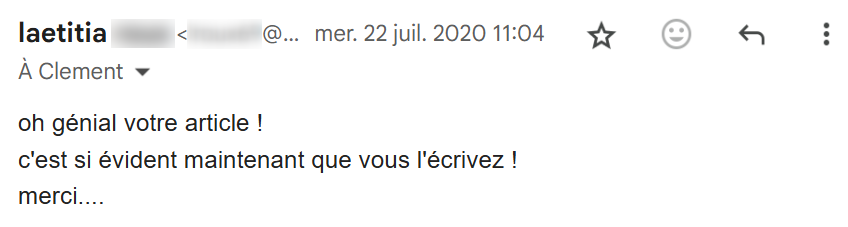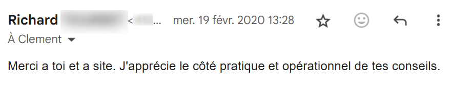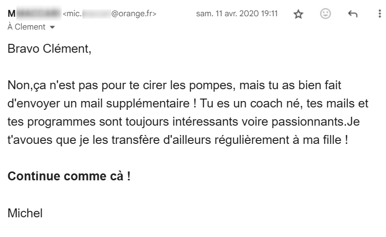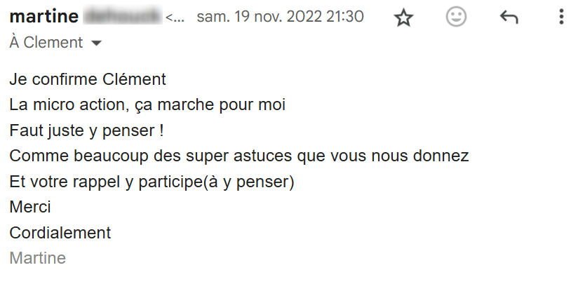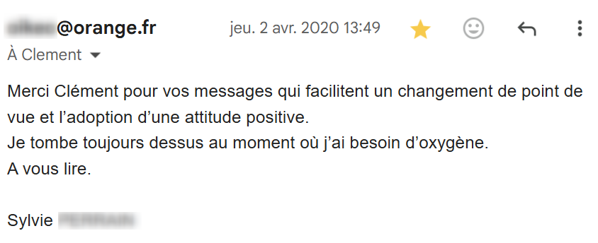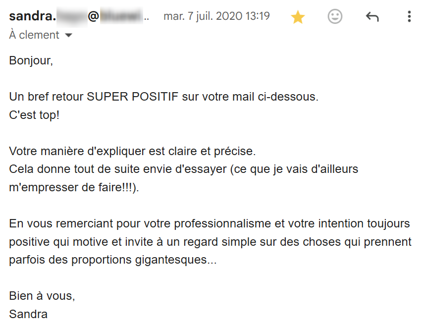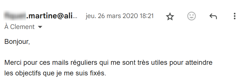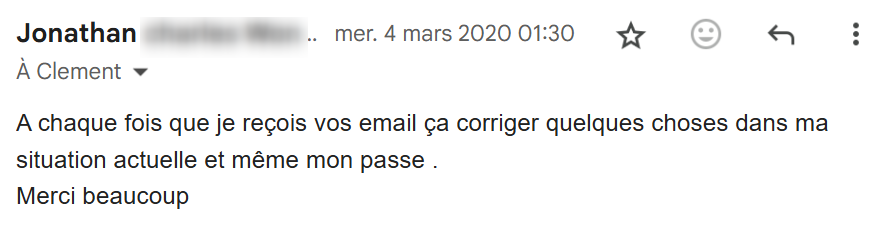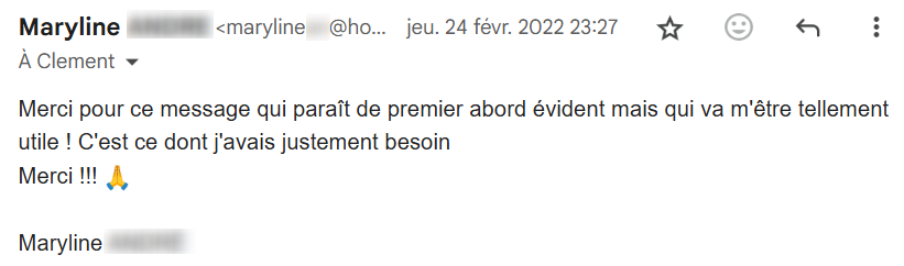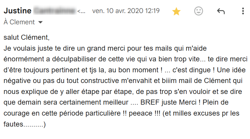Je lis régulièrement tes e-mails qui m’inspirent et viennent consolider tout ce que j’ai appris et mis en pratique depuis que j’ai découvert tes conseils, il y a maintenant 4 mois.