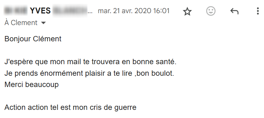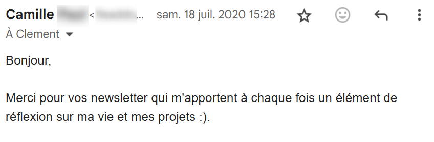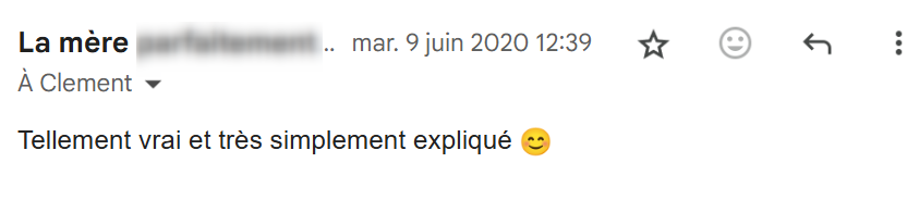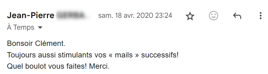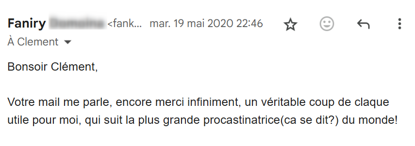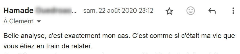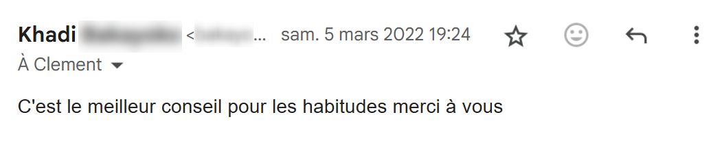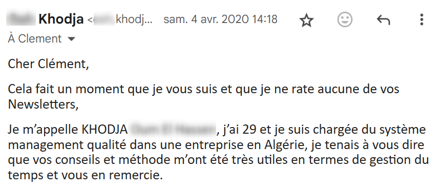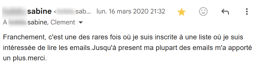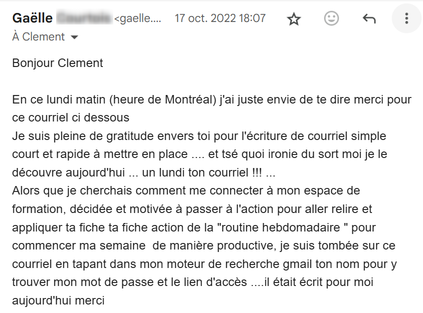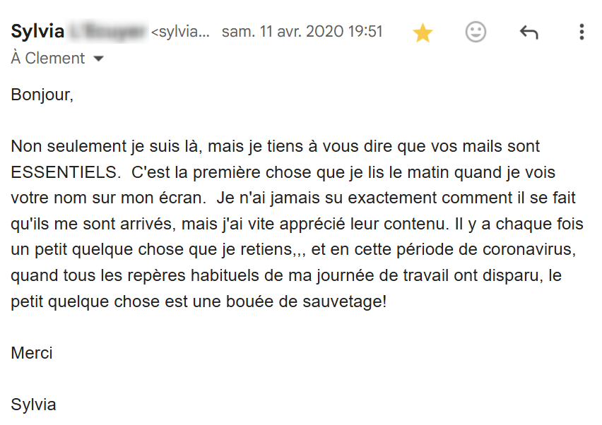 Je lis régulièrement tes e-mails qui m’inspirent et viennent consolider tout ce que j’ai appris et mis en pratique depuis que j’ai découvert tes conseils, il y a maintenant 4 mois.